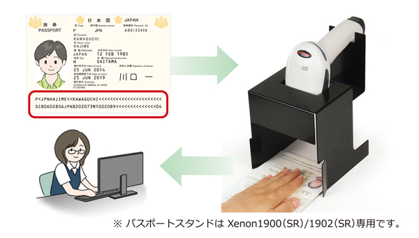 「パスポートOCR」「パスポートスタンド」と「Xenon1900(SR)」により、低コストでパスポート読み取りシステム構築が可能です。